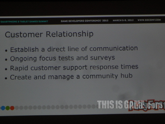 為了維持跟顧客的關係,最基礎的必要部分就是直接的溝通管道,持續進行焦點團體測試與問卷調查,如此才能快速且正確地蒐集到玩家想要的遊戲內容。