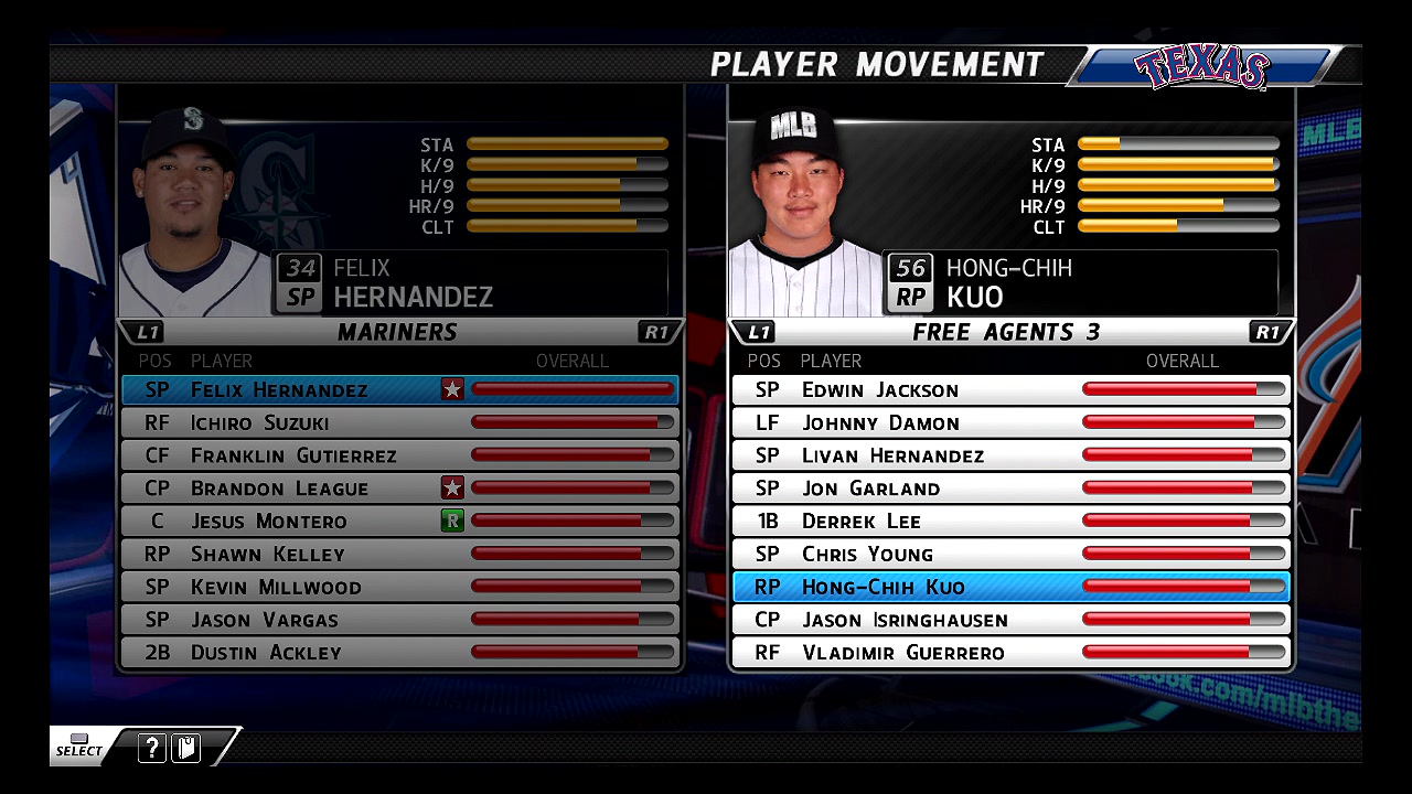 因為遊戲是由去年例行賽結束為止的最終名單,在球員名單上玩家期待的陳偉殷跟達比休可能都還不在名單上面。不過像是郭泓志和其他的一些球員們,玩家可以在自由球員的名單上找到。