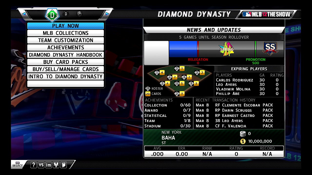 美國職棒大聯盟 12》此次新推出的鑽石王朝(Diamond Dynasty),完整的結合了球卡交易系統跟王朝系統,讓玩家們可以藉由棒球卡片來創造並組織自己的球隊來跟美國職棒大聯盟的球隊來挑戰累積積分
