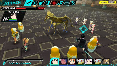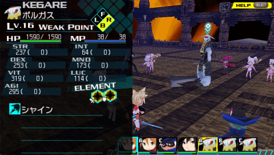 在迷宮中碰到污穢的話就開始戰鬥了。在本作的戰鬥中,要如何來對污穢的弱點來攻擊是很重要的。戰鬥開始時,首先打開「INFO」來確認污穢的情報。污穢的弱點方向「WEAK POINT」會以黄色來顯示。只要攻擊污穢的 WEAK POINT的 話就可以給予大損傷。