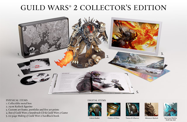 激戰 2》發售的數位豪華版,主要是比一般數位版多了 5 項虛擬寶物,其中包括迷你寵物、隨身倉庫等道具。至於售價 149.99 美元的實體典藏版部份,除了擁有數位豪華版所附贈的所有虛寶以外,還可以獲得十吋的 Rytlock 公仔、厚達 112 頁的遊戲設定集、彩色原畫複製品、特製相框,以及遊戲原聲帶 CD。