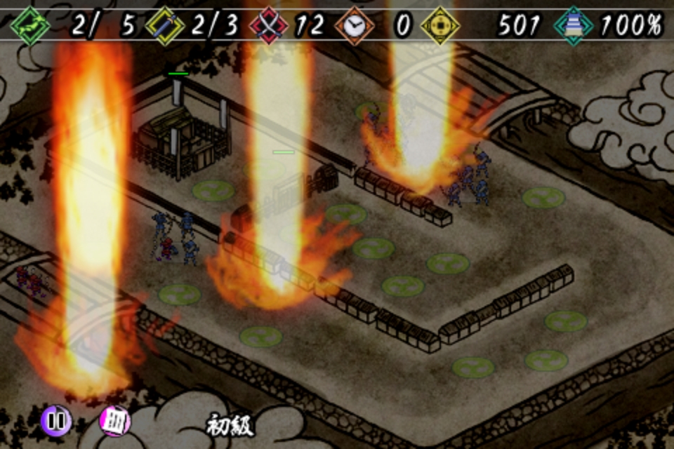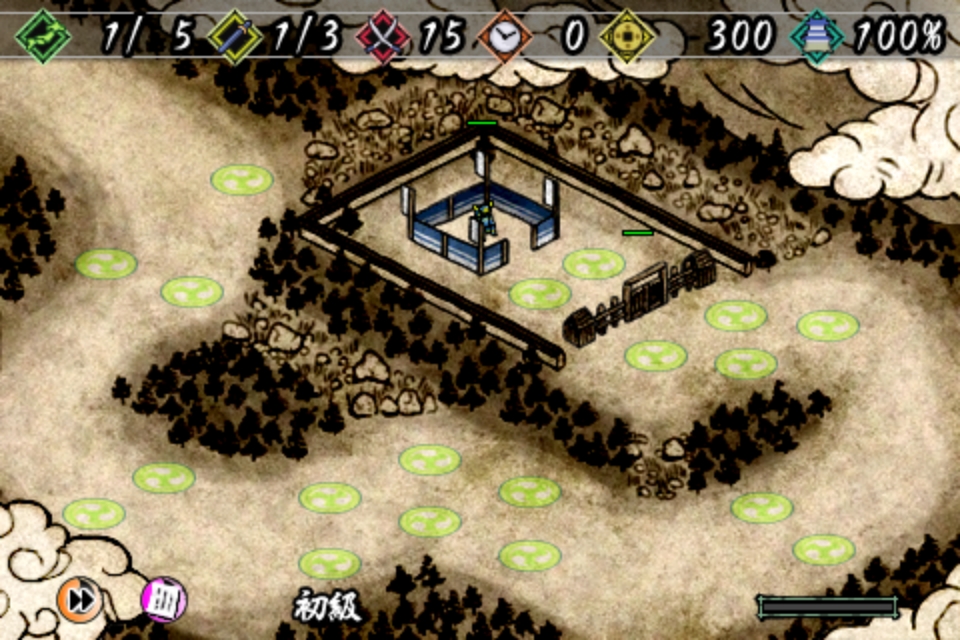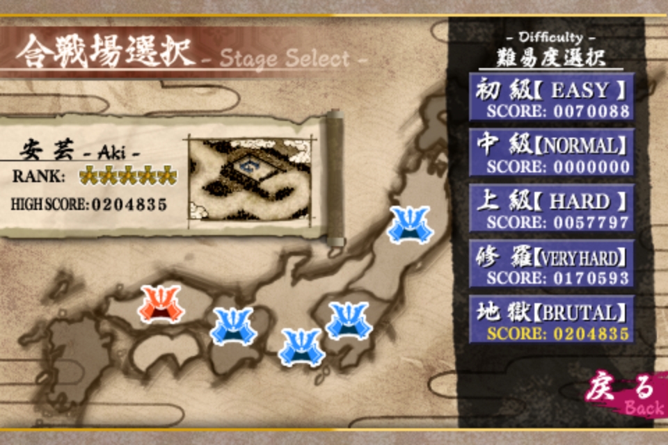 場景地圖由甲斐、大阪、安芸、陸奧到江戶共分為五大關卡場景,各場景地形配置有所落差,每個關卡又可選擇初級、中級、上級而至修羅、地獄等五種難度,不過最末兩種級別必須通過玩家漸次挑戰才會顯現。