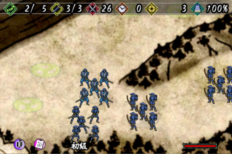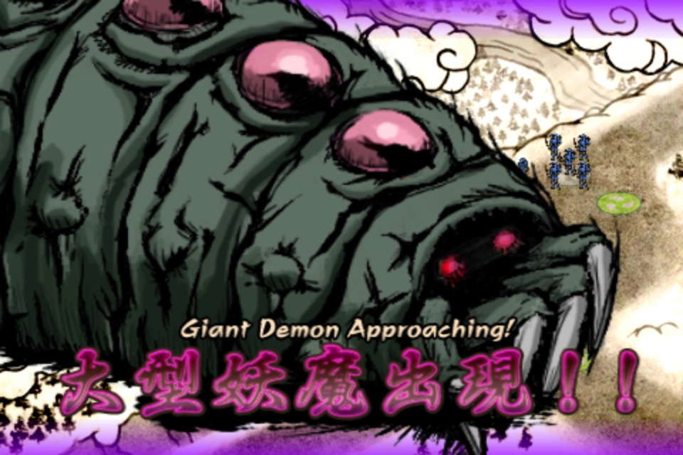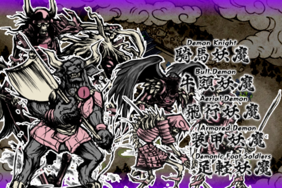 最基本的足輕妖魔沒什麼威脅性暫且不提。空行師的飛行妖魔無視地形的突襲初次接觸遊戲的玩家可能會因此手忙腳亂。牛頭妖魔攻擊力強但移動遲緩。裝甲妖魔是弓兵剋星,對遠距攻擊防禦力特別突出。看似將領的騎馬妖魔速度快、威力強,需要耗費更多的人力才能制服。
