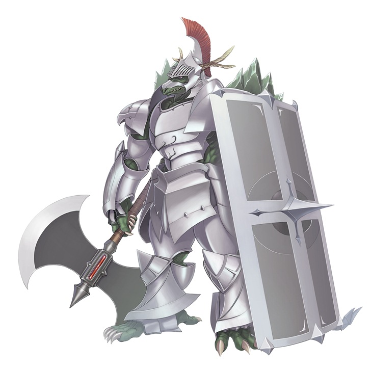 以強韌的肉體著稱、龍人族的重騎士。身為白龍教團的守護者、擁有守護龍那及人們的使命。雖然外表威武,但生存的信念是「守護弱者」、內心善良。在戰鬥中以強力的防禦能力著稱,能夠勝任盾職。