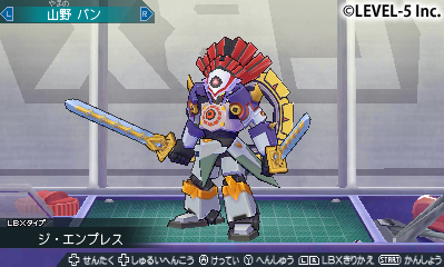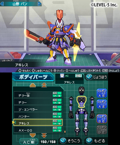 上畫面便是以 3D 模組顯示的 LBX。手心大小的小型機器人在 N3DS 上面感覺更加的貼近玩家。下畫面能夠利用觸控筆、將自己擁有的組件移至「核心骨架(コアスケルトン)」。