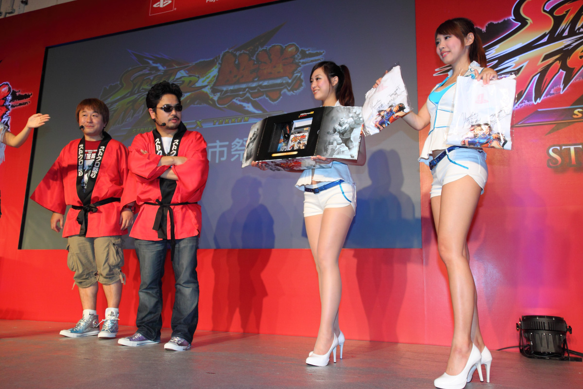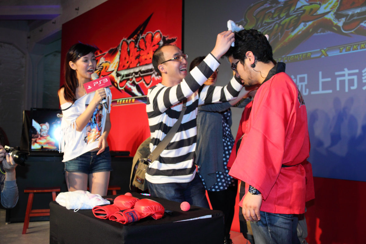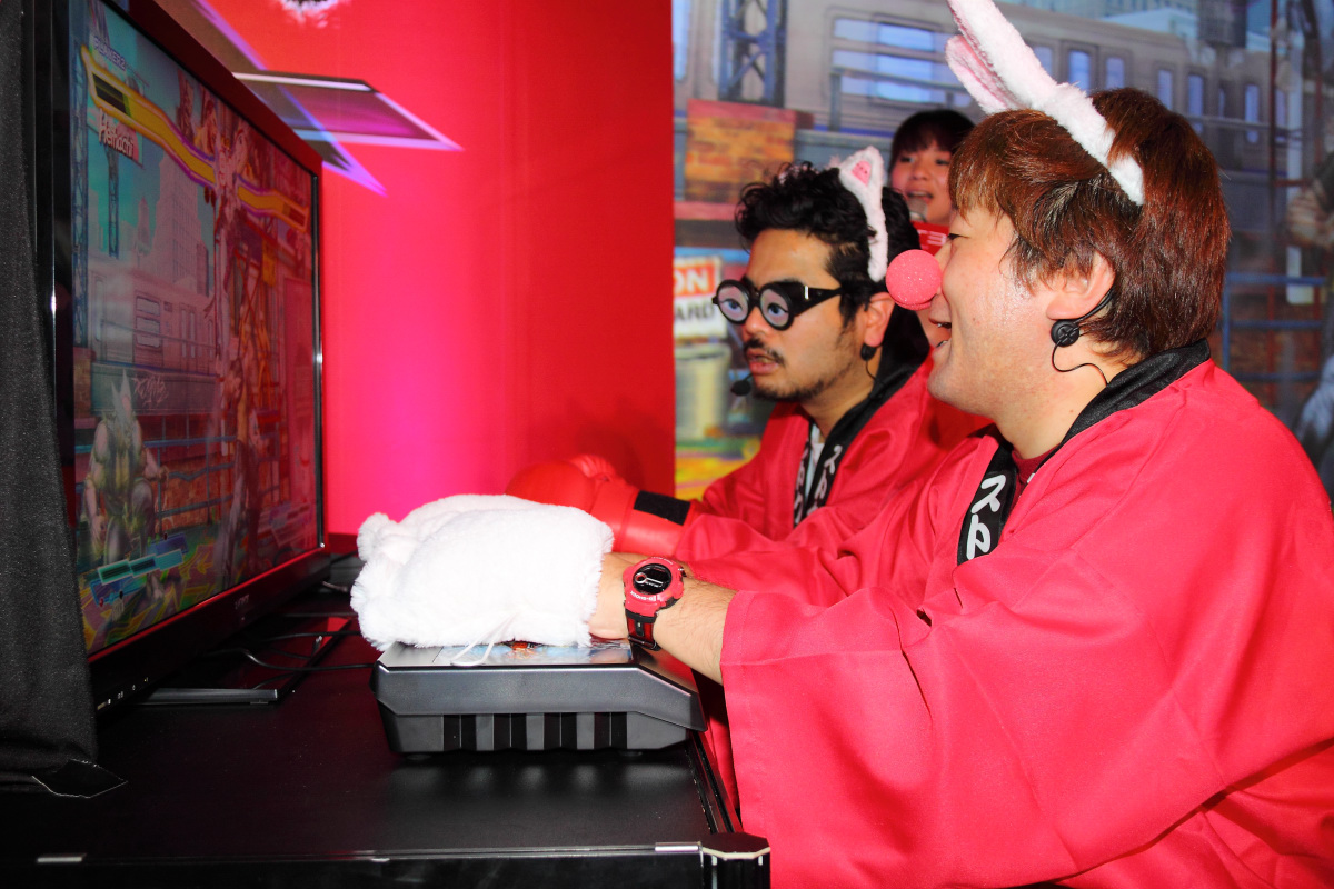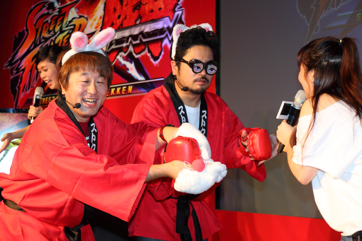 緊接著展開的是「情侶挑戰賽」,現場由主持人選出一對幸運的玩家情侶上台與兩位製作人以混戰模式一決勝負。為了消弭雙方的實力落差,兩位製作人被要求必須讓手得戴上各種干擾用道具來打。戴上貓爪手套的小野義德幾乎沒辦法操作搖桿或按鈕。戴上搞笑眼鏡的原田勝弘更慘,連眼前有啥都看不清楚,像個老眼昏花的爺爺般還得由小野義德攙扶才能找到位置。在這樣極端不利的狀態下,兩位製作人自然是輸給玩家情侶,拱手將《快打旋風 X 鐵拳》大型搖桿同梱組送出。