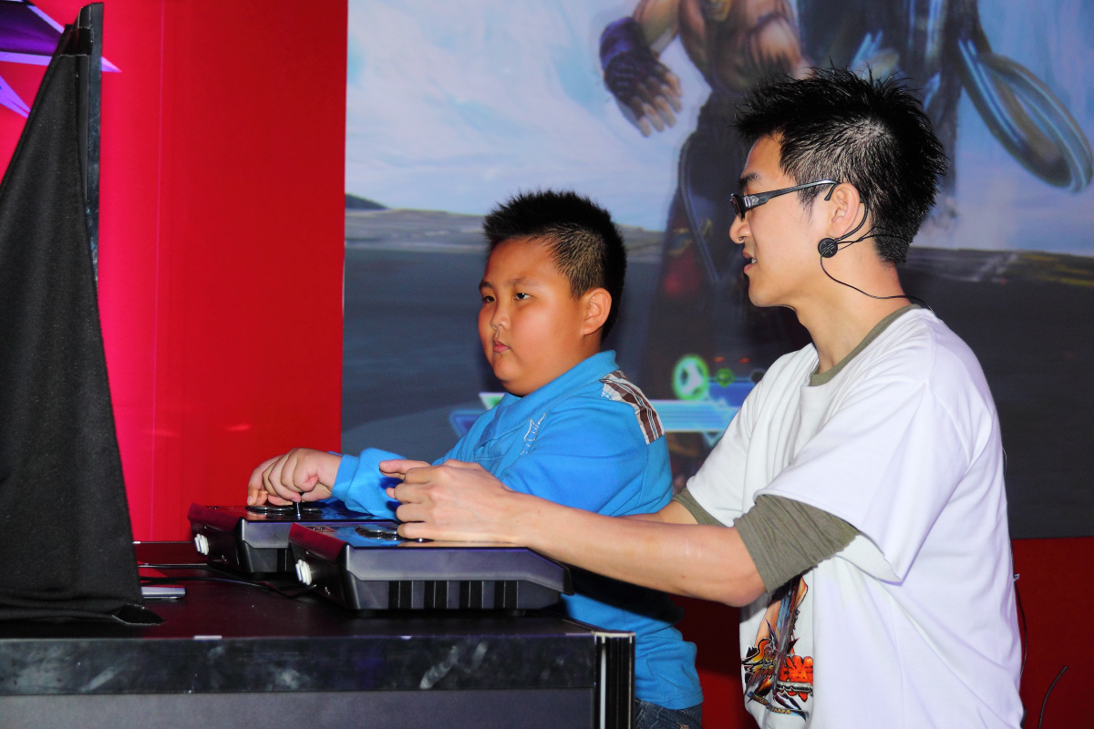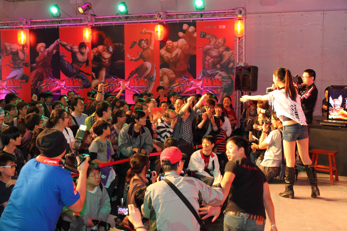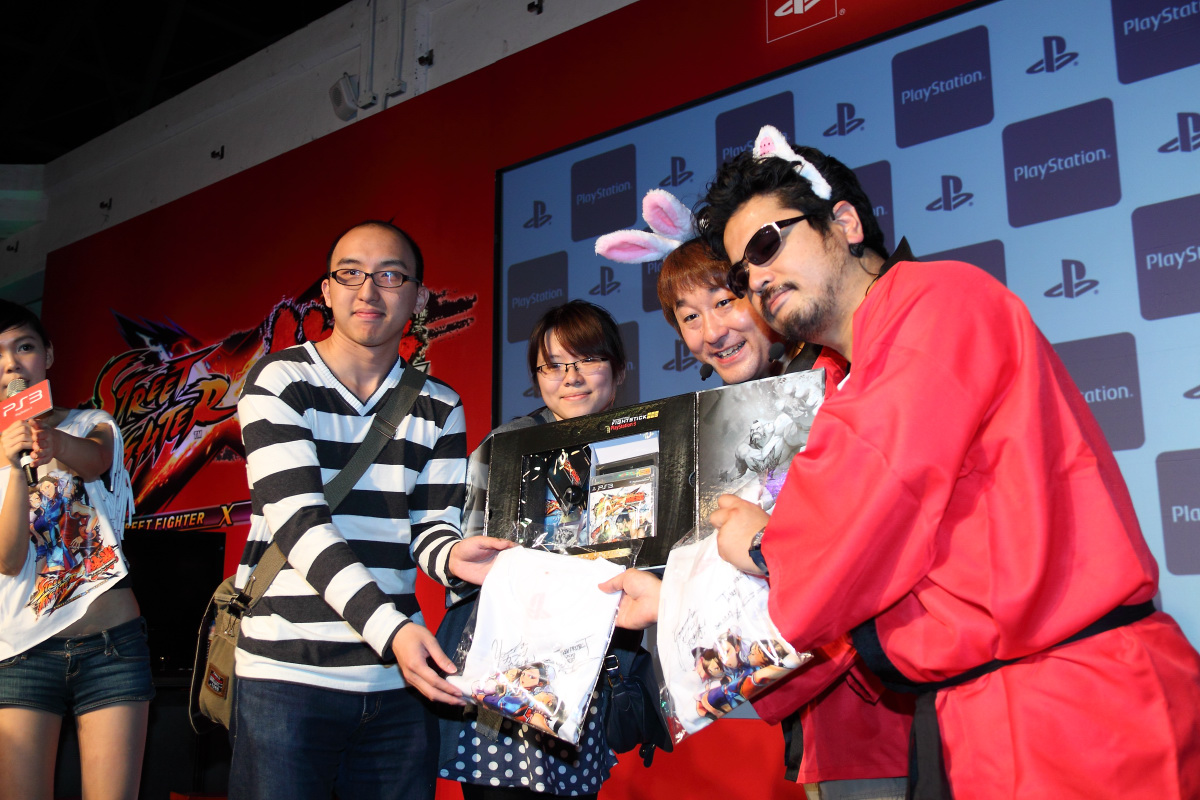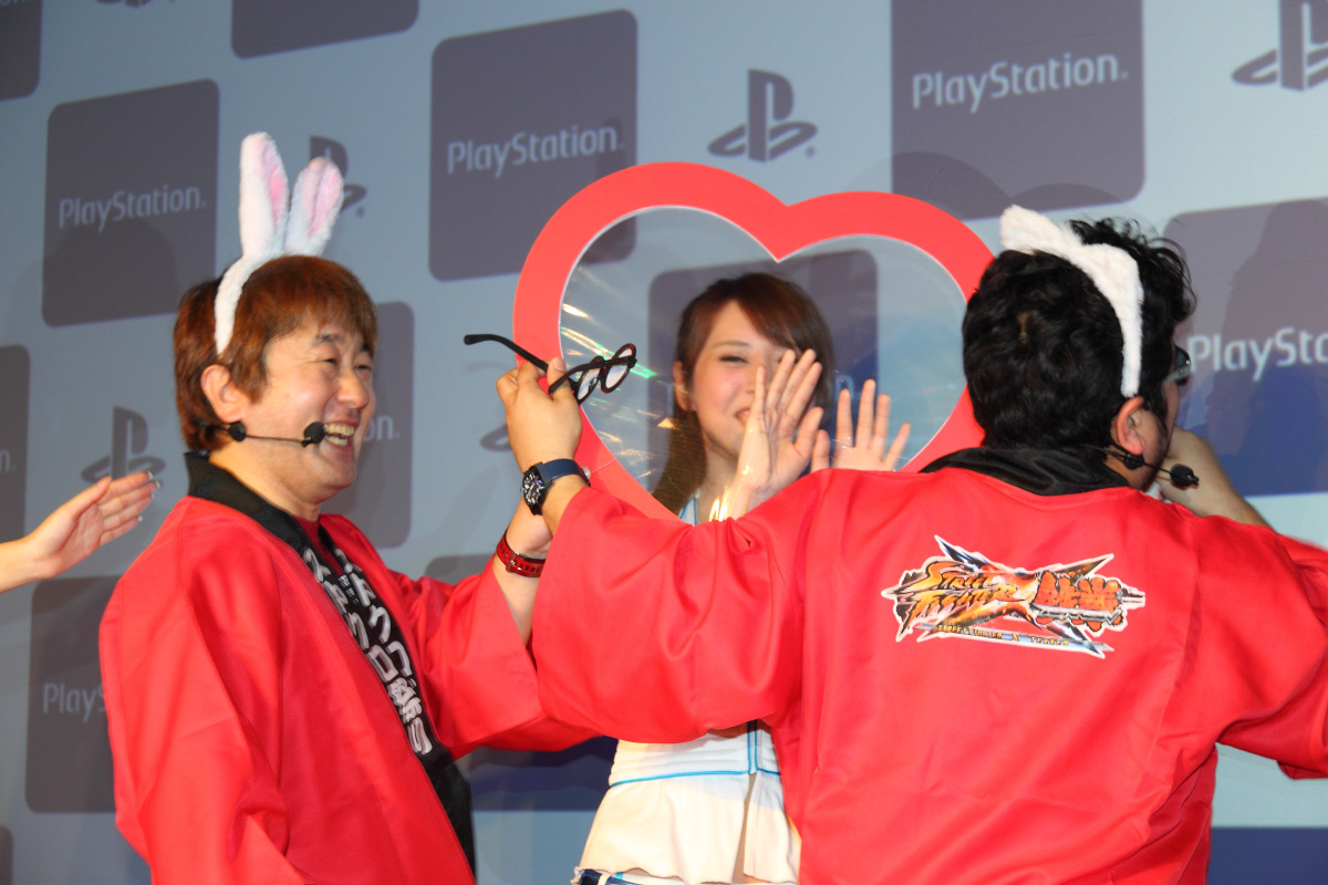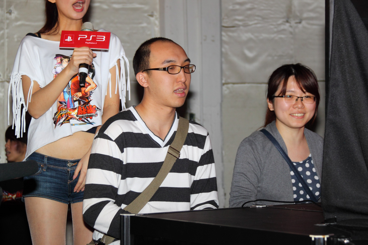 緊接著展開的是「情侶挑戰賽」,現場由主持人選出一對幸運的玩家情侶上台與兩位製作人以混戰模式一決勝負。為了消弭雙方的實力落差,兩位製作人被要求必須讓手得戴上各種干擾用道具來打。戴上貓爪手套的小野義德幾乎沒辦法操作搖桿或按鈕。戴上搞笑眼鏡的原田勝弘更慘,連眼前有啥都看不清楚,像個老眼昏花的爺爺般還得由小野義德攙扶才能找到位置。在這樣極端不利的狀態下,兩位製作人自然是輸給玩家情侶,拱手將《快打旋風 X 鐵拳》大型搖桿同梱組送出。
