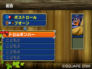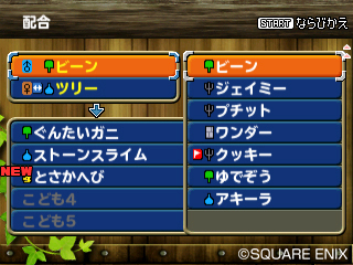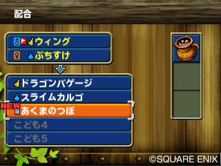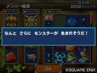 勇者鬥惡龍 怪獸仙境》系列中大家熟悉的配合系統,在本作中也可以在能夠誕生出來的小怪獸中從中選擇想要的。不管選擇哪個小怪獸幾乎都會比父母親來得強,所以就選擇自己喜歡的吧!