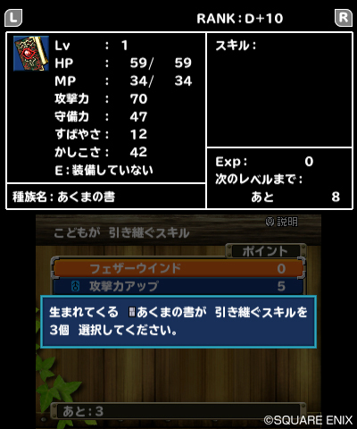 而在本作中,配合的時候偶而會生出「惡魔之書(あくまの書)」這種特別的怪獸。這隻怪獸能夠繼承小怪獸無法學會的技能,所以不會浪費掉雙親的技能,可以好好的來運用。