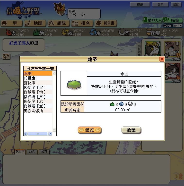 信喵之野望》中兵糧是支撐起玩家進行活動的最基本資源,無論進行合戰、參加貓相撲等活動,都必須花費兵糧,兵糧的主要取來源依靠玩家在里建設水田之後的收成,玩家可在遊戲初期,先行建設兩畝水田和兩座兵糧庫,並按照需求升級,才能擁有足夠兵糧。