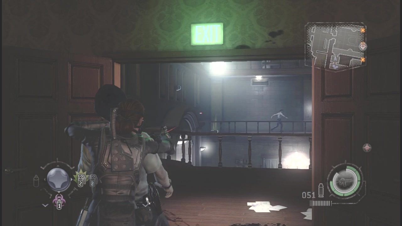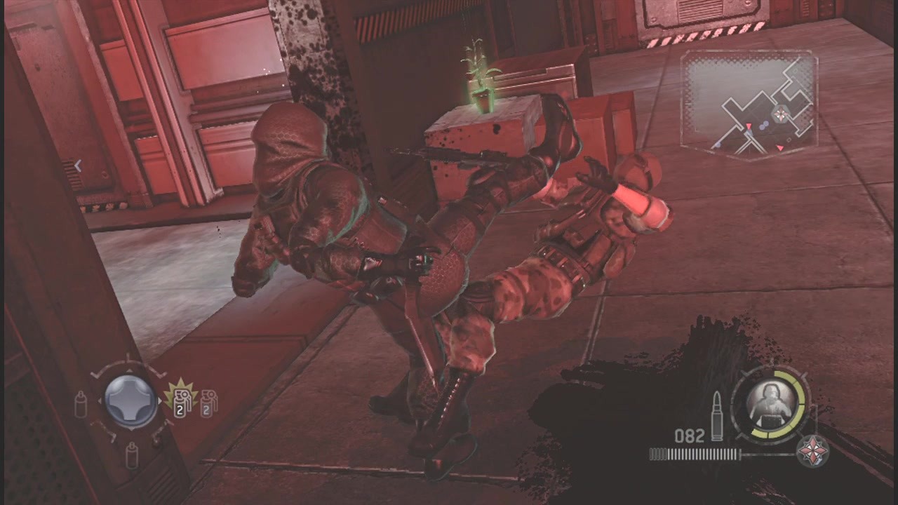 另一個更須注意的重點,就是 USS 的隊員們並不像是系列作有頭有臉的主角們,被殭屍啃了都沒事,在《拉昆市行動》中,只要玩家被殭屍襲擊受傷,就有一定的機率被感染 T 病毒,同時角色也會慢慢扣血,萬一沒來得及使用紫色的疫苗噴霧治療,該角色就會在死亡後變成殭屍發狂攻擊隊員,避免危險,這個時候就先送他一發子彈比較實在。
