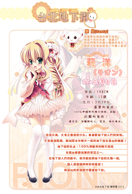 地下街形象人物「莉洋」是為了慶祝台北地下街 12 週年所全新設計的形象人物。而替「莉洋」配音的聲優,則是跨海邀請到日本知名聲優「花澤香菜」擔任。花澤香菜曾演出多位知名角色,包括《