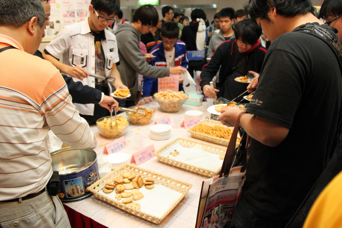 今日活動以自助茶會方式進行,現場準備了 5 層的生日蛋糕塔,以及提供了免費點心及飲料自助享用。而在活動開始之前,也可以看到外面長長的人龍,準備排隊進入會場迎接活動開始。