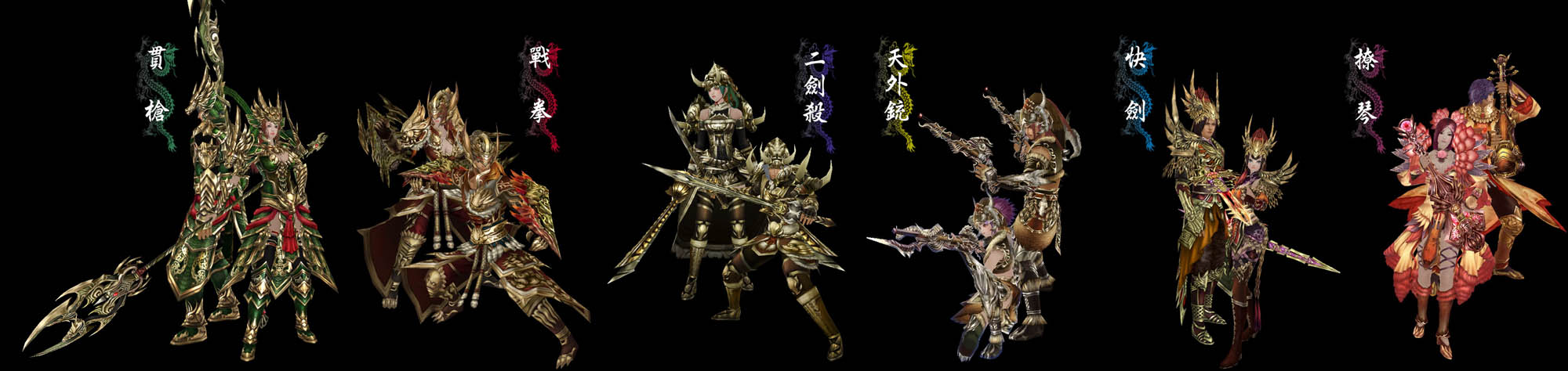 萬夫莫敵,其中「霸撼系」提供厚重防禦,「迅崩系」則以見縫插針的雙重攻擊提供重大傷害;同為重甲職業的還有手握槍戟的「貫槍」,分為「神槍系」、「鬼刺系」,擅於操使長槍,兼具優秀的攻防能力,還可釋放氣場協助隊友。
