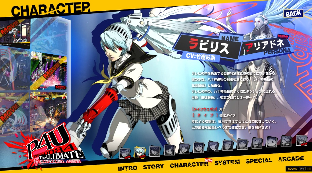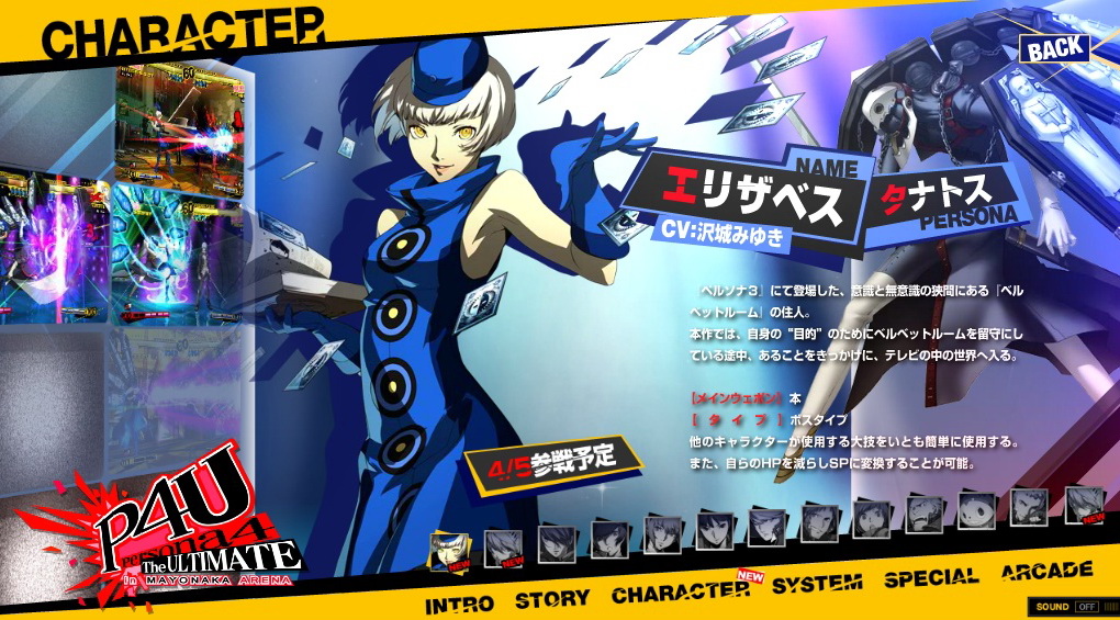 女神異聞錄 4 終極深夜鬥技場(ペルソナ4 ジ・アルティメット イン マヨナカアリーナ)》更新了官方網站,釋出新角色「伊麗莎白(エリザベス)」以及「闇影拉比莉絲(シャドウラビリス)」的介紹。