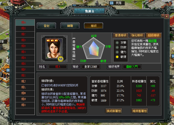2.精研後重置一次武將的成長分佈,需要消耗一定的銅幣或元寶。