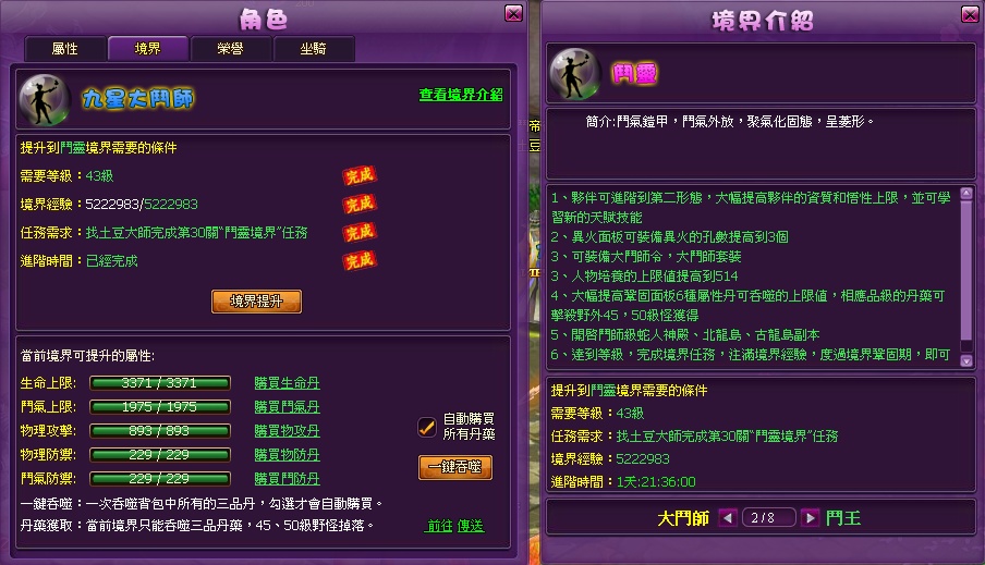 除此之外,每到達一個境界都能透過吞食境界丹來提升自身屬性,境界丹有著不同的效果,例如提升生命上限的生命丹、提升鬥氣的鬥氣丹等等,這些丹藥都可以透過打怪來取得,但是玩家只能服用符合當前境界的丹藥,太低階或高階的是不能使用的。