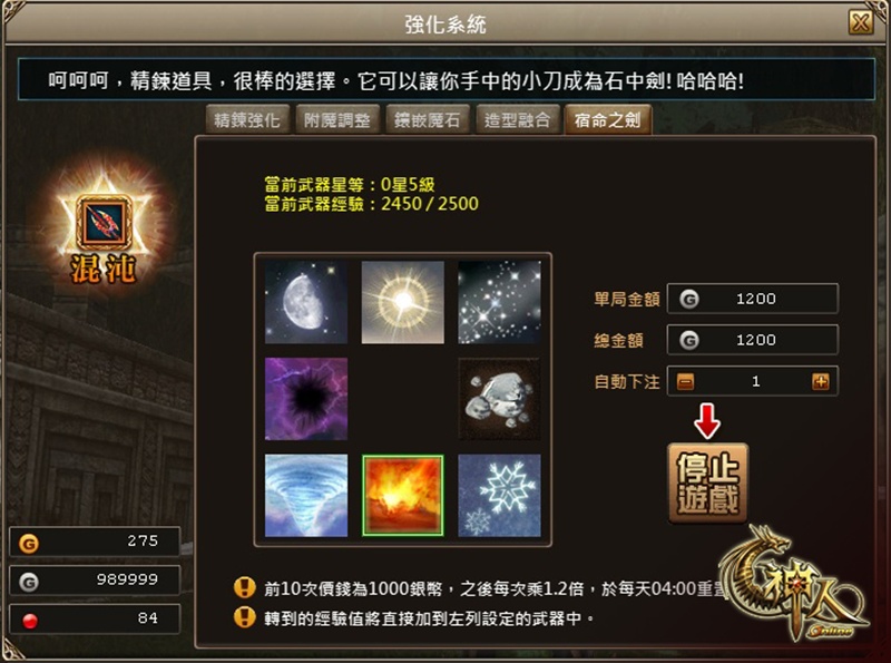 宿命之劍的培養,就是依靠著精華進行的,只要開啟強化介面上的「宿命之劍分頁,玩家就可以打開獲取精華的介面,只要花費遊戲幣來轉動盤面,最後停下來的位置,就是玩家可獲得的精華。每種精華所能汲取出的經驗值不盡相同,這可是考驗玩家運氣的時間了。