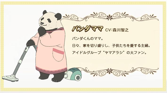 熊貓先生,住在咖啡廳的旁邊,充滿孩子氣的個性,因為應徵咖啡廳的打工失敗後, 在企鵝先生的介紹下跑去動物園打工「當熊貓」(笑) |