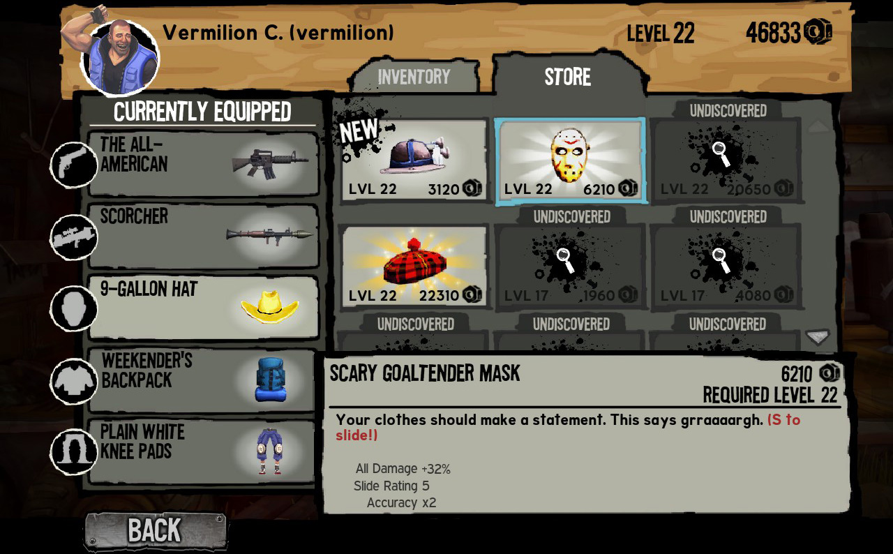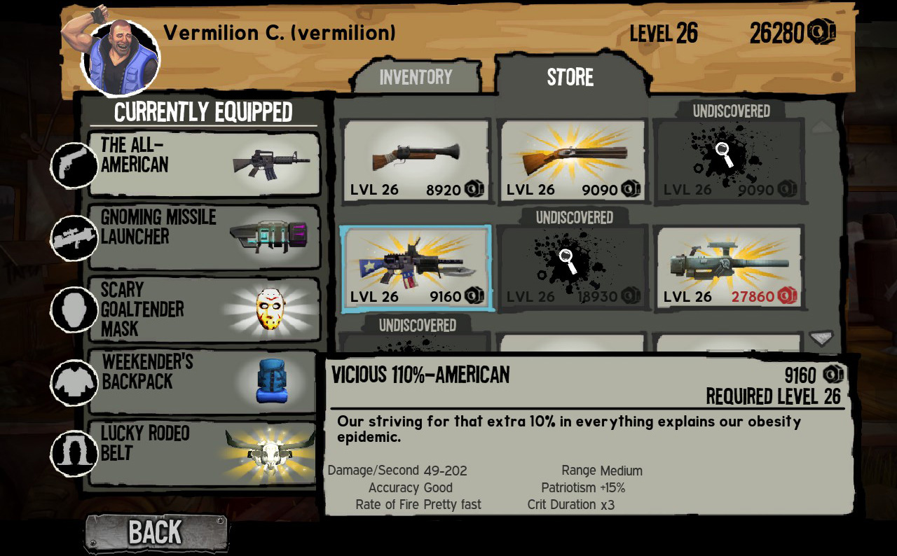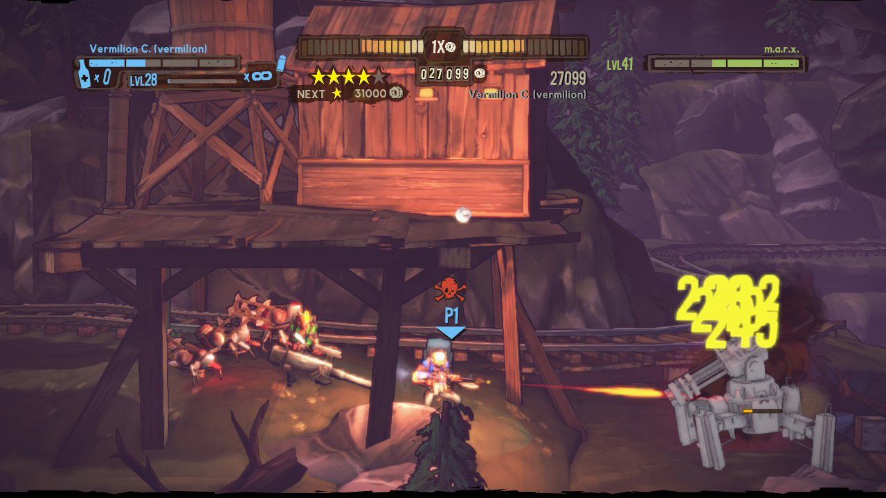 配件的升級也是重點。遊戲內的配件不僅造型多樣,每種配件都有不同的優勢或是特別能力,像是提升攻擊力、攜彈量增加、移動力提升等等。玩家可以使用戰場上蒐集的齒輪來購買裝備,並用最拉風的行頭來裝扮自己。這些配件絕大多數都帶有詼諧和惡搞的風格,配上搞笑的說明文字總能令筆者噴飯。線上模式還有機會看到更多荒唐的裝扮,欣賞其他玩家的德行也是一種樂趣。