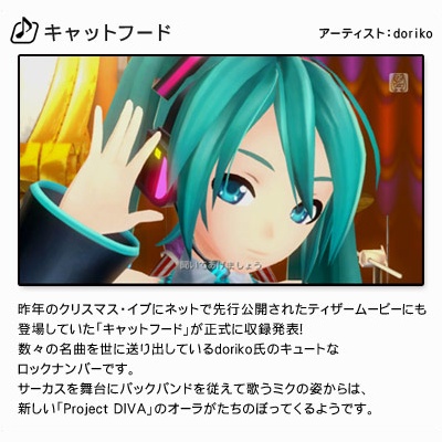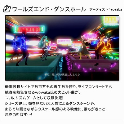 遊戲將廣泛收錄各方創作者精心製作的眾多初音未來家族演唱歌曲,目前已確定將會收錄「貓食(キャットフード)」與「世界結束舞廳(ワールズエンドダンスホール)」等網路人氣歌曲。