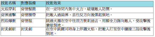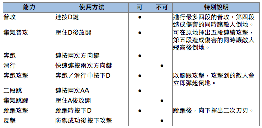 技能方面,「背德之炎」與「反叛之翼」皆為攻擊性技能;且能瞬間打飛敵人,進行連續攻擊。