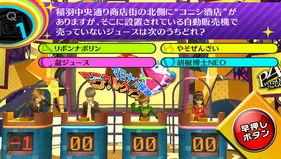 | 「深夜橫斷神奇問答(預選)」小熊的,由小熊帶來的,為了小熊的機智問答節目。挑戰由小熊出題的關於《女神異聞錄 4 黃金版》的問題吧! |