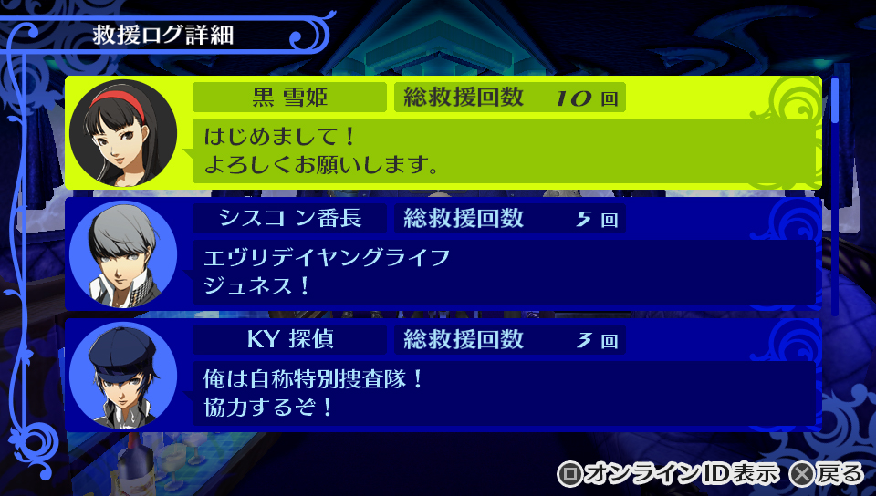 | 名片裡會紀錄受到救援的次數等等。要向不認識的玩家感謝! |
