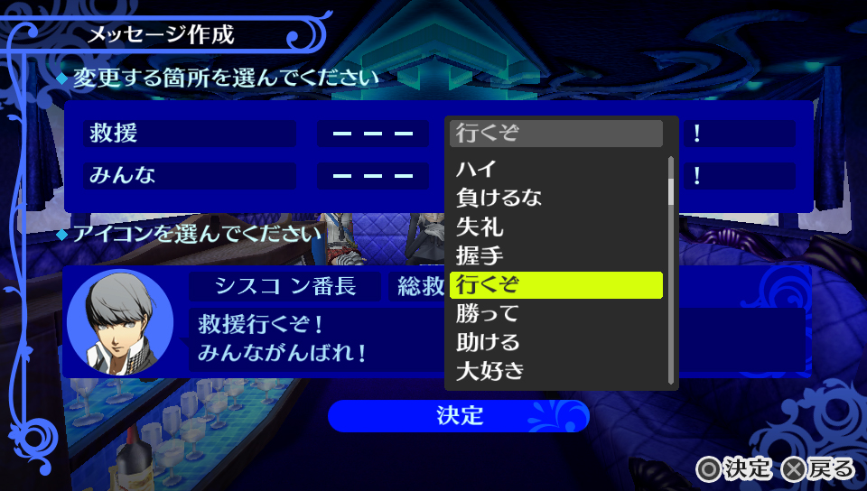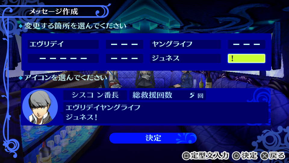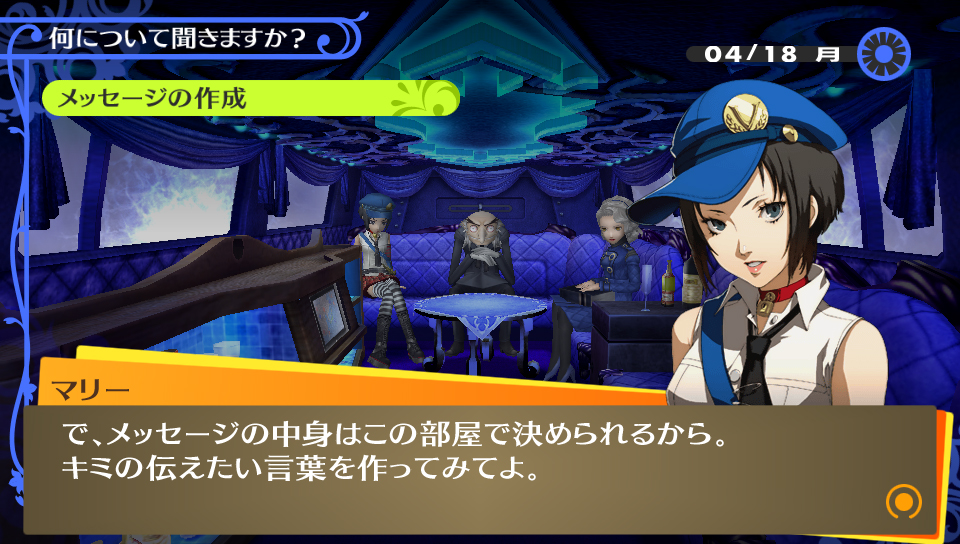 | 跟天鵝絨間裡的瑪莉說話時,就能編輯名片了。因為可以選訊息設定進去,所以就來作出原創的名片吧! |