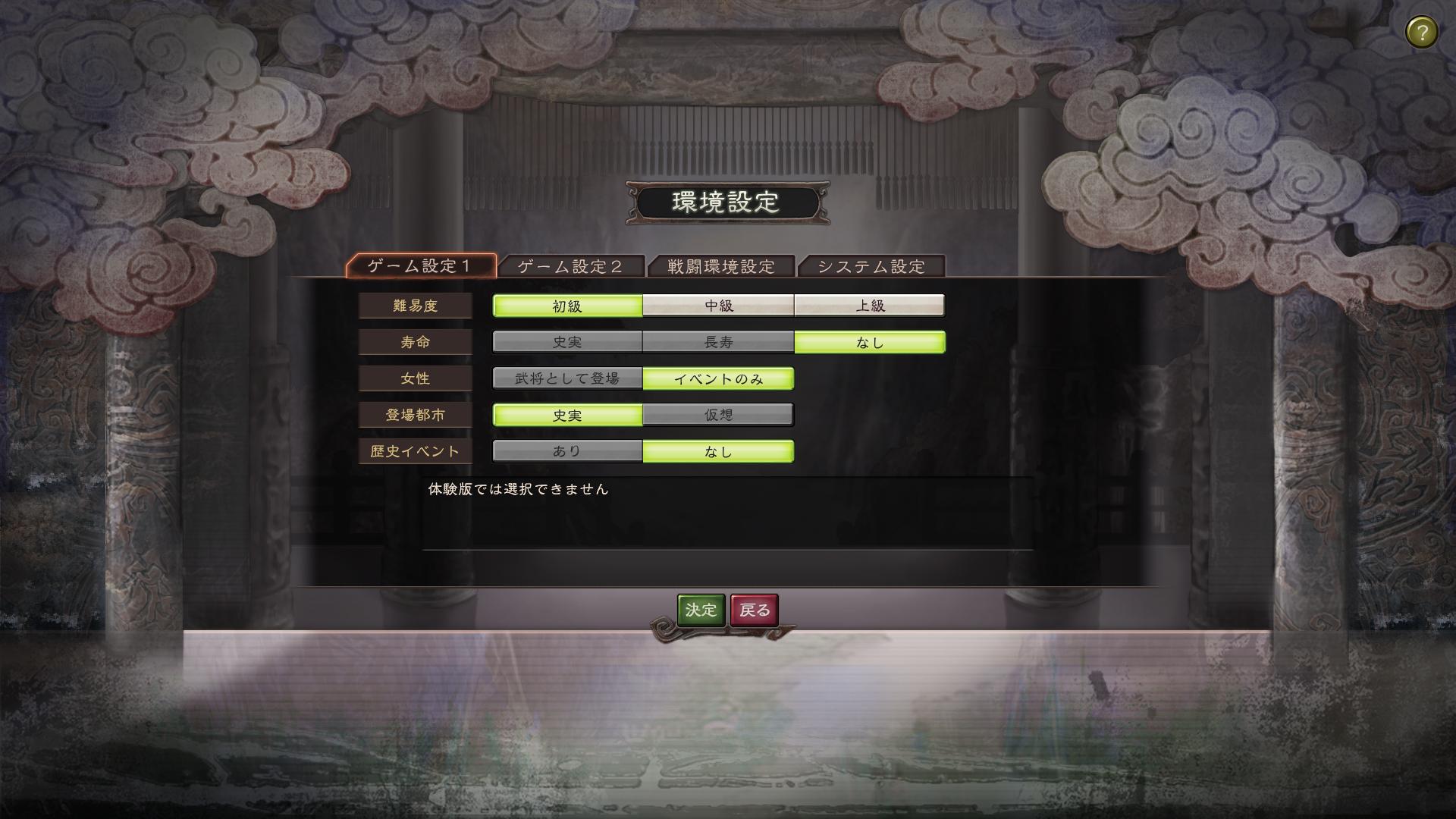 體驗版可以玩到的內容是以「黄巾之亂」為舞台的劇本,玩家(何進)軍與張角軍分別有兩座都市的狀況下開始遊戲。玩家要攻向張角擁有的都市,只要殲滅黄巾軍的話就過關了。而初級的話是非常容易就能過關(一開始就出陣攻打也沒問題)的難度,就算是初學者也不用擔心。對自己實力有自信的玩家就選擇中級/上級的難度來挑戰看看吧。