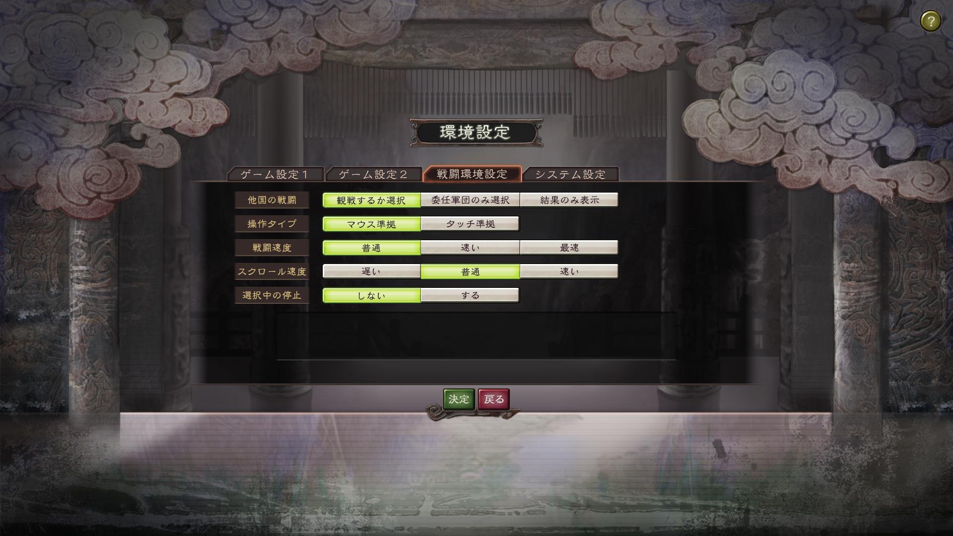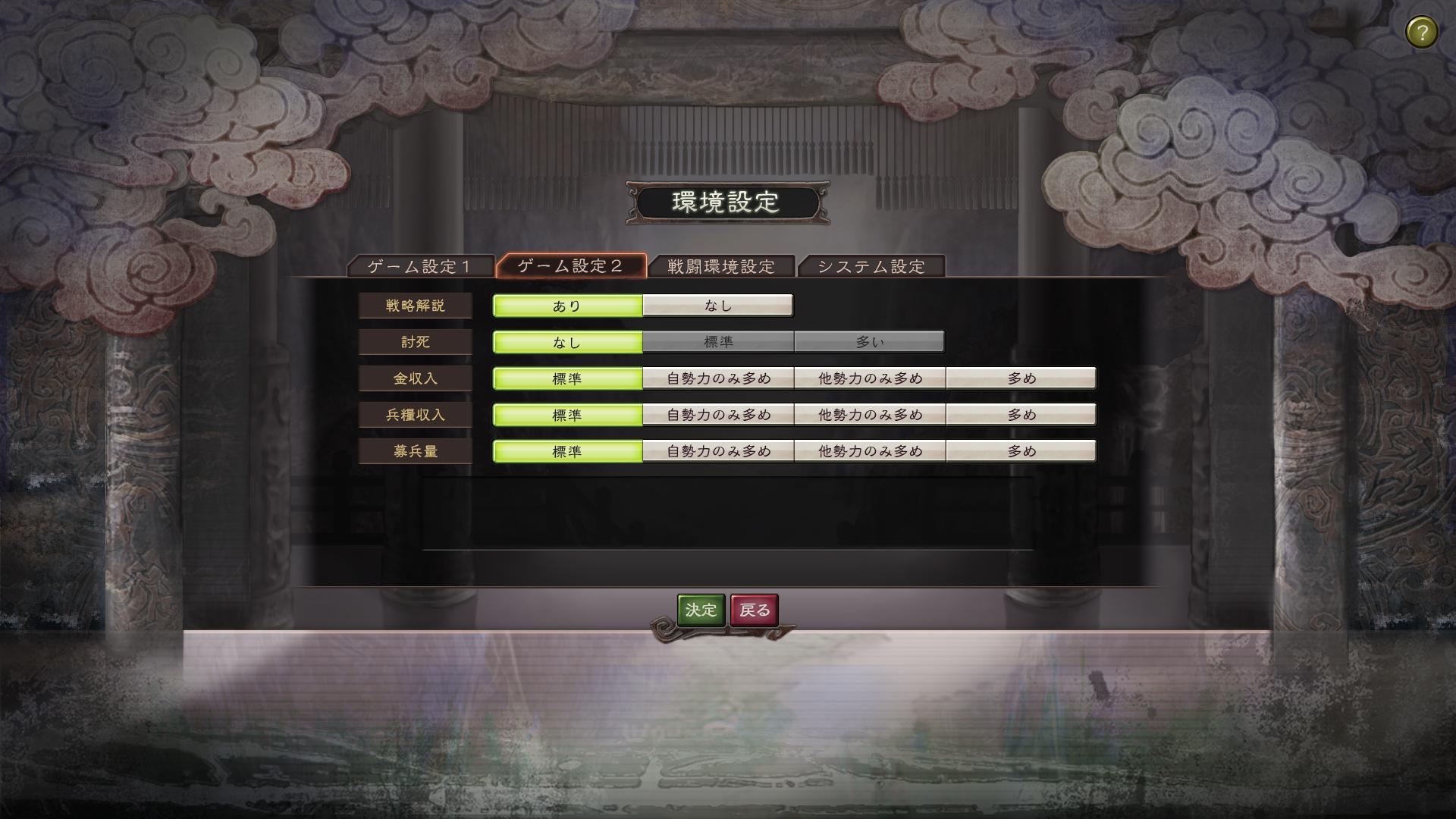 遊戲啟動後會顯示 5 顆按鈕。環境設定在剛剛選擇新遊戲時所進行的設定是一樣的,在這就不用再一次進行設定了。