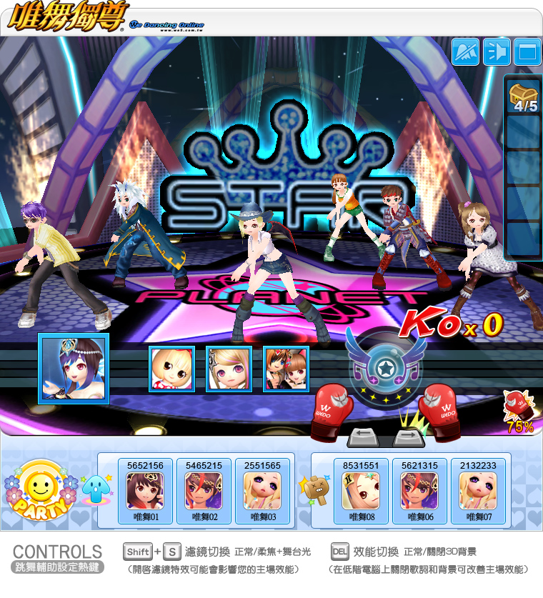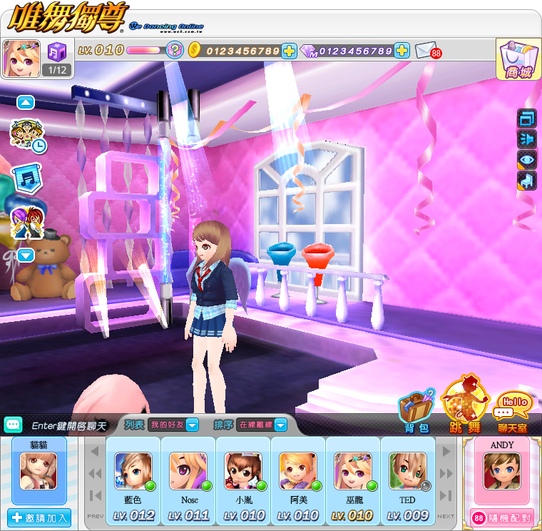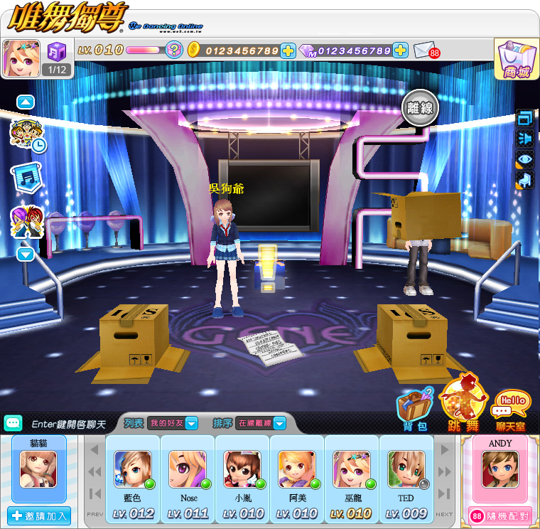 每個玩家都有一個自己的個人包廂,在包廂中玩家可以選擇不同的風格佈景、個性道具來裝飾,而這些佈景及裝飾,都可以藉由完成特殊任務取得。除了自己的包廂外,玩家也可以拜訪朋友的包廂,以及陌生朋友的包廂,和他們一起聊天、跳舞互動。