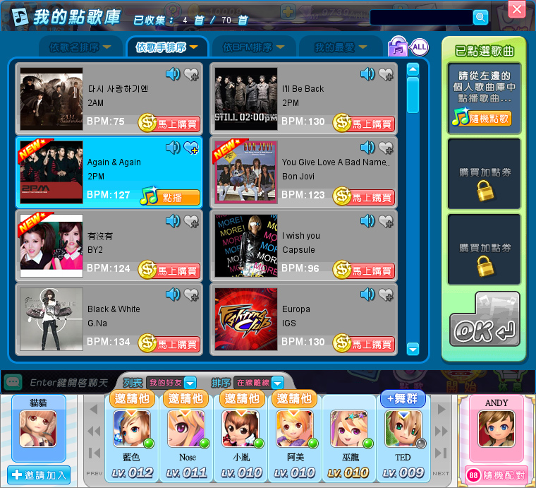 | 我的點歌單,解任務、和好友跳舞就有機會獲得新歌 |