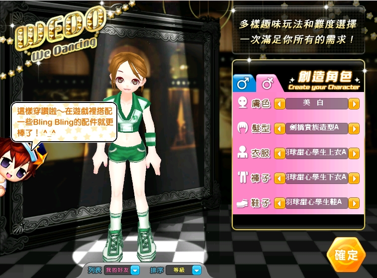 第一次進入遊戲,玩家需要幫自己的角色打造一個外型,玩家可以選擇男性或女性角色,接著再調整角色的膚色、髮型、衣服、褲子、鞋子,就可以開始遊戲了。