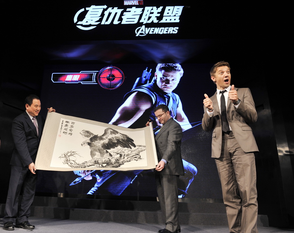 復仇者聯盟》(The Avengers) 在北京舉行了亞洲首映。影片主角之一,“鷹眼”傑瑞米·雷納(Jeremy Renner)親臨出席,與記者們暢談影片的台前幕後與精彩看點,另一位主演山謬傑克森(Samuel L. Jackson)也通過視頻向記者與影迷問好。而主辦方順應角色,為傑瑞米送上一幅國畫的雄鷹展翅圖,傑瑞米更親自為老鷹點睛。