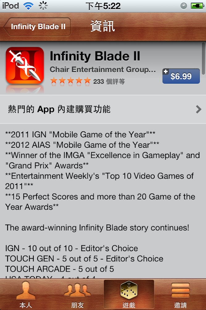 『建議』的部分,系統會針對目前好友共同遊玩的遊戲或者是玩家過去遊玩遊戲的類型做建議與推薦,而在本次 iOS 5 的系統更新中,玩家可以直接在 Game Center 中直接付費購買及執行遊戲,相當方便,這樣的話就不用在各個程式分頁中切來切去了。