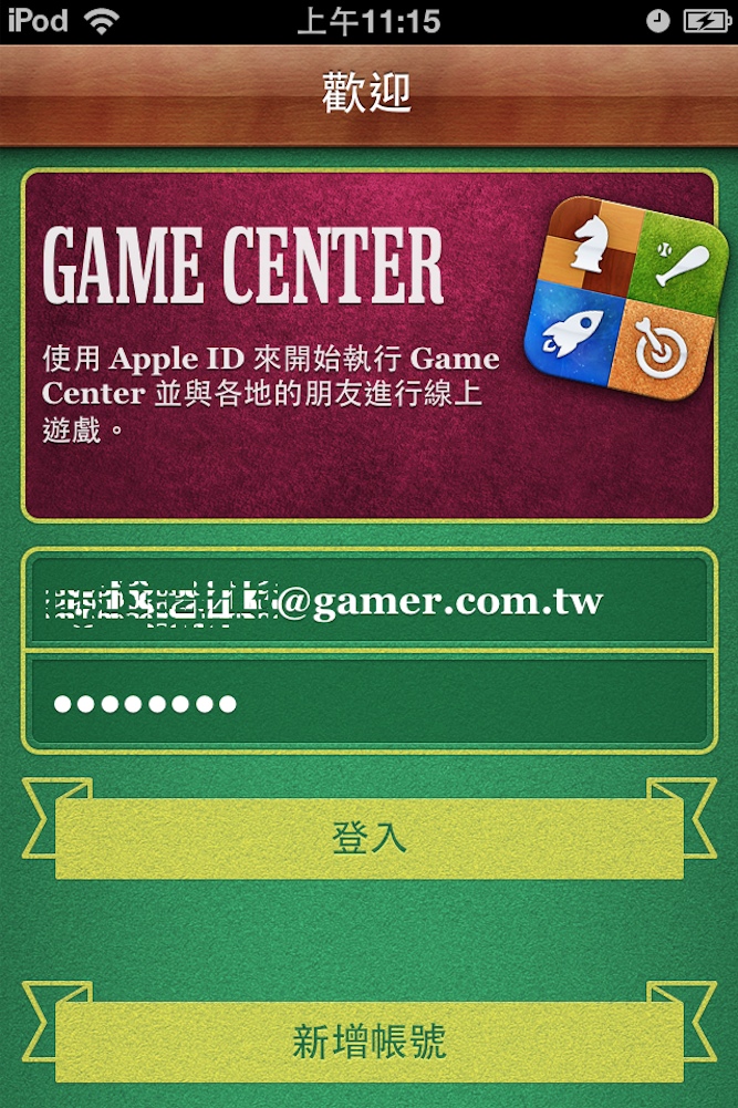 首先是登入介面,玩家可以選擇新增帳號或者是直接以 APPLE 帳號登入,若你在過去已經有使用過 APP Store,系統會預設載入你的帳號,登入後就正式啟用 Game Center 服務了