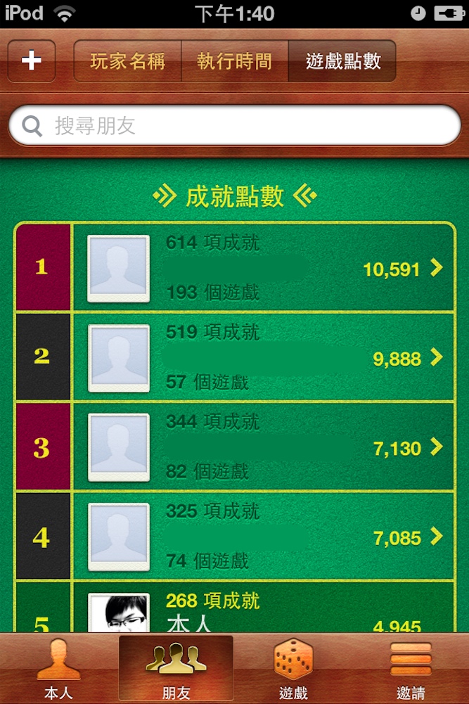 遊戲點數:系統將會依照點數多寡進行排行,亦可瞭解朋友的遊戲點數。點選好友後即可進入其詳細資訊,同樣包含遊戲、點數、朋友。