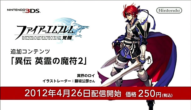 聖火降魔錄 覺醒(ファイアーエムブレム 覚醒)》發表了可讓過去作品中的角色客串出場的第 2 彈與第 3 彈追加 DLC 。將於 4 月 26 日公開的兩套 DLC 中,「異傳 英靈的魔符 2(異伝 英霊の魔符2)」的羅伊(ロイ)一角是出自由繪師藤坂公彦所繪製的封印之劍羅伊;以及「異傳 王對王 紋章編(異伝 王対王 紋章編)」的利夫(リーフ)一角是出自由繪師 和田 幸子(ワダサチコ)所繪製《