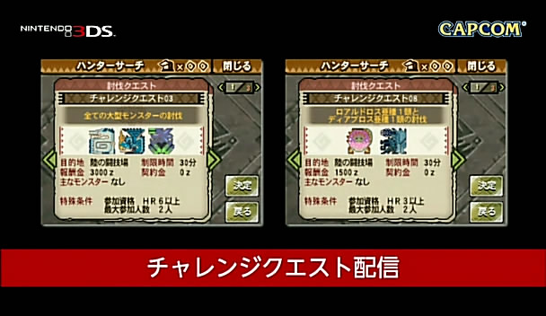 魔物獵人 3 G(モンスターハンター3(tri-)G)》則配合 Nintendo Direct,準備了討伐系的兩件挑戰任務,於宣傳節目結束後開始開放下載。