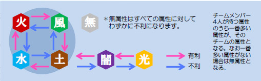 屬性分為「火」「水」「土」等共七種,舉例來說「火對風強,但對水弱」「水對火強,但對土弱」,各自設定有不利跟有利。針對敵人的弱點來給予大損傷是讓戰鬥進行更有效率的秘訣。