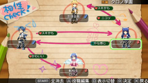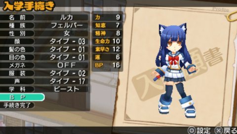 創造自己喜歡的角色來加入學園的生活吧。種族、性別、聲音、眼珠顏色以及眼鏡等等都可以自由設定組合。設定好與隊伍成員的相性的話,還可以發動技能喔。