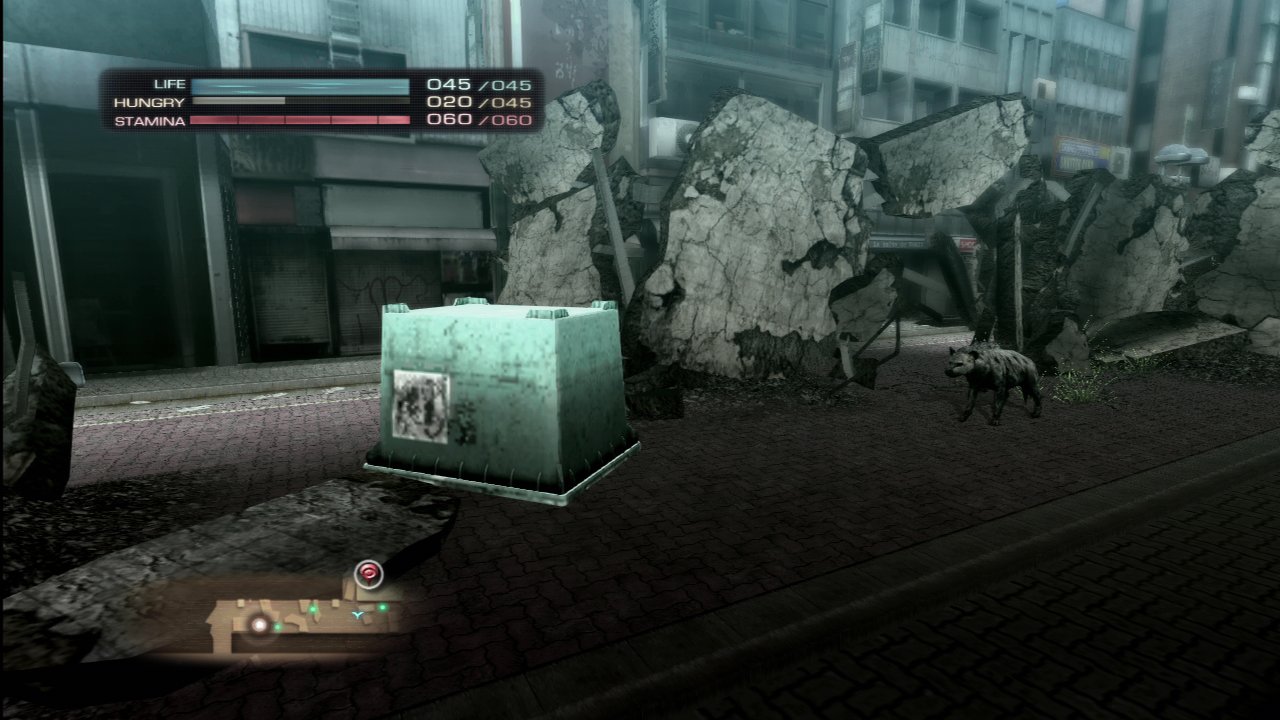 街上有許多可以方便躲起來的東西。躲在垃圾箱裡面一邊小心別讓鬣狗發現一邊移動吧。