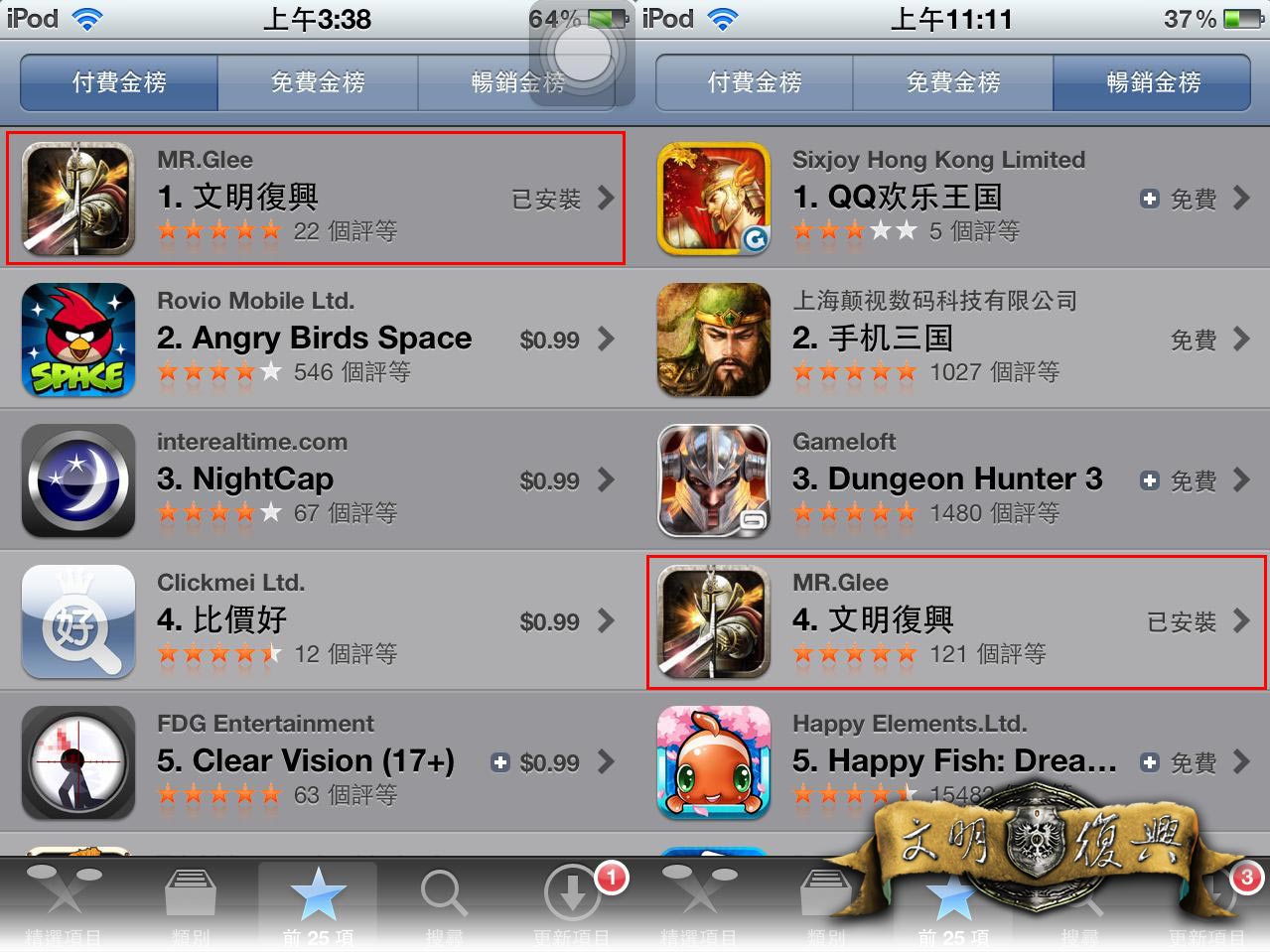 文明復興》不但成為國內下載排行第一名,還在不到24小時之內,成為iOS app store遊戲付費榜的第一名,正式打敗《