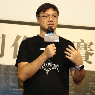 | 遊戲組評審代表任學璽(左一) | 任學璽與遊戲組參賽者交流 |