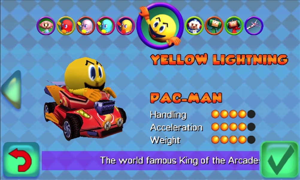 小精靈卡丁車》共有 10 位玩家耳熟能詳 Namco Bandai 經典人物供玩家挑選,例如