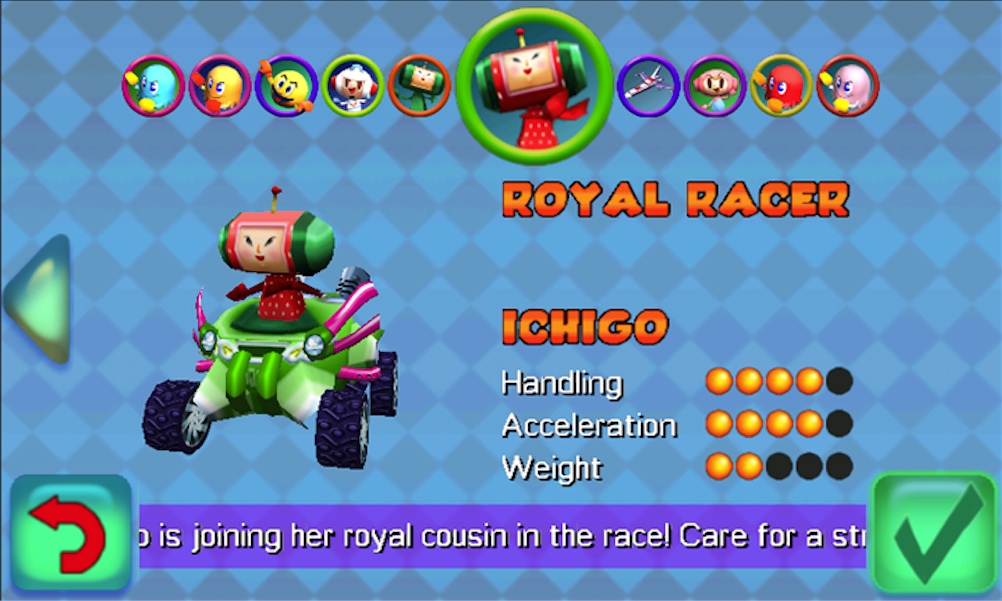 塊魂王子以及 Ms. Driller 等等,此外還有多款賽車可以讓玩家選擇。比賽過程中各類的加速輔助品,以及各類道具都增添了比賽的精采程度,至於賽車場景方面也隨著每次關卡的不同而有所變化。
