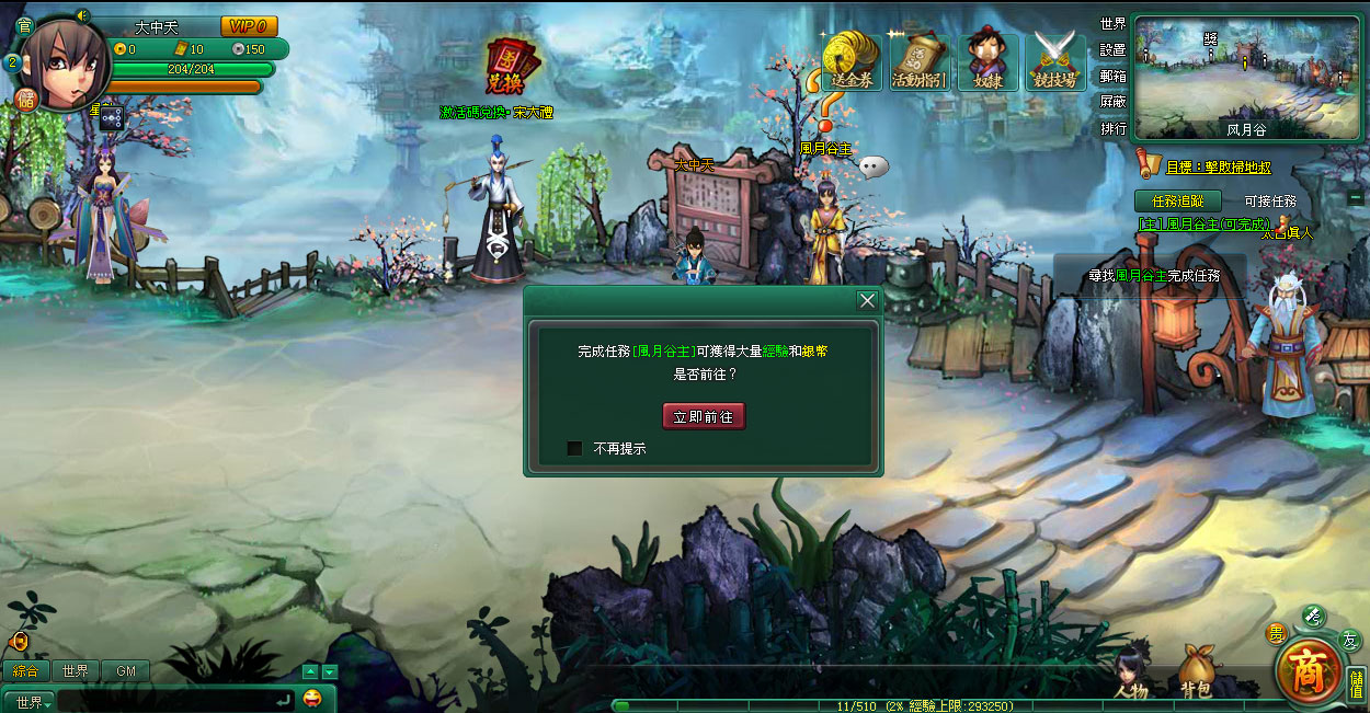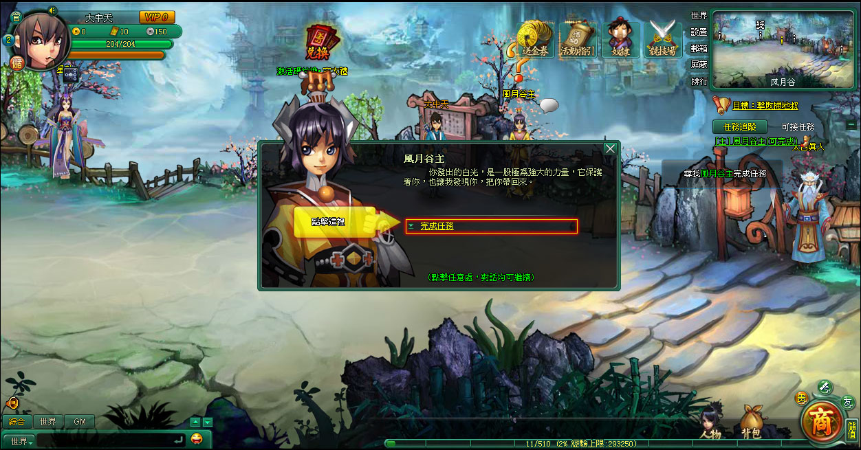 一開始會於風月谷展開最基本的新手任務,並且透過方便的自動尋路、自動打怪,和遊戲介面操作的指引下,遊戲快速上手。如果不知道下一步該做些什麼,系統還會自動跳出訊息提醒接下來該如何繼續進行遊戲喔!