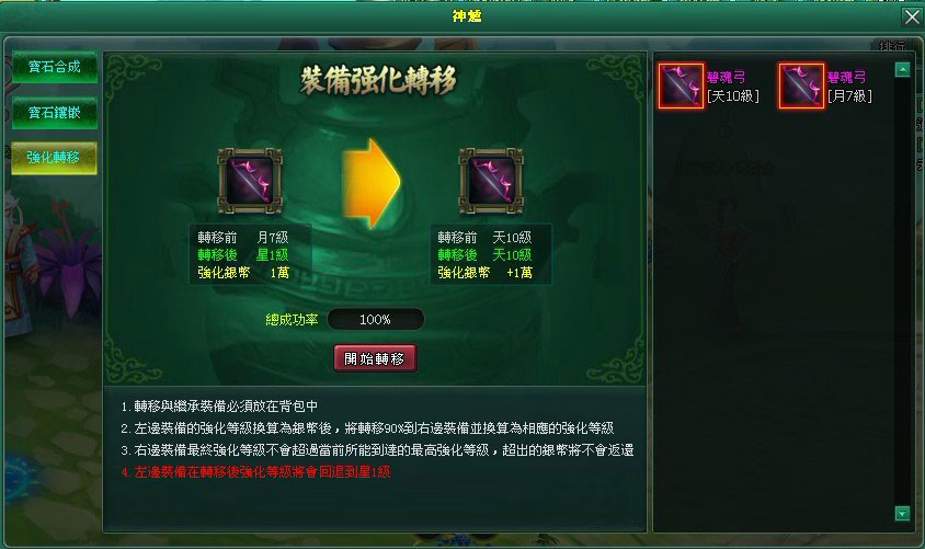 除此之外,《異界逍遙》擁有獨特的「裝備強化轉移」系統,讓你不再是喜新厭舊的代言人,也不用再為舊裝備哭泣!只要透過裝備轉移,就能讓舊裝備的強化等級轉換到新裝備身上,讓你快速擁有高階裝備、強化更簡便!