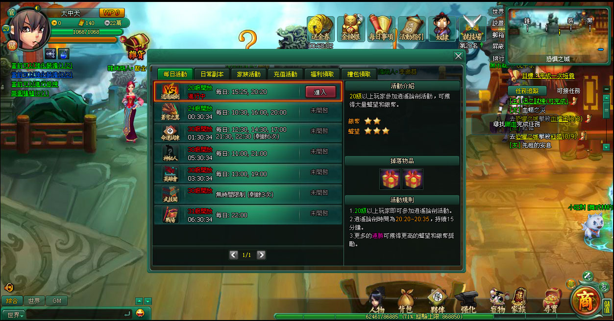 擔心系統太複雜的人也別擔心,只要點選畫面上方的活動指引,即可快速了解自己當下可以參加哪些活動、任務。無論是每日活動、日常副本、家族活動、每日福利還是禮包兌換,輕輕鬆鬆,一目了然!